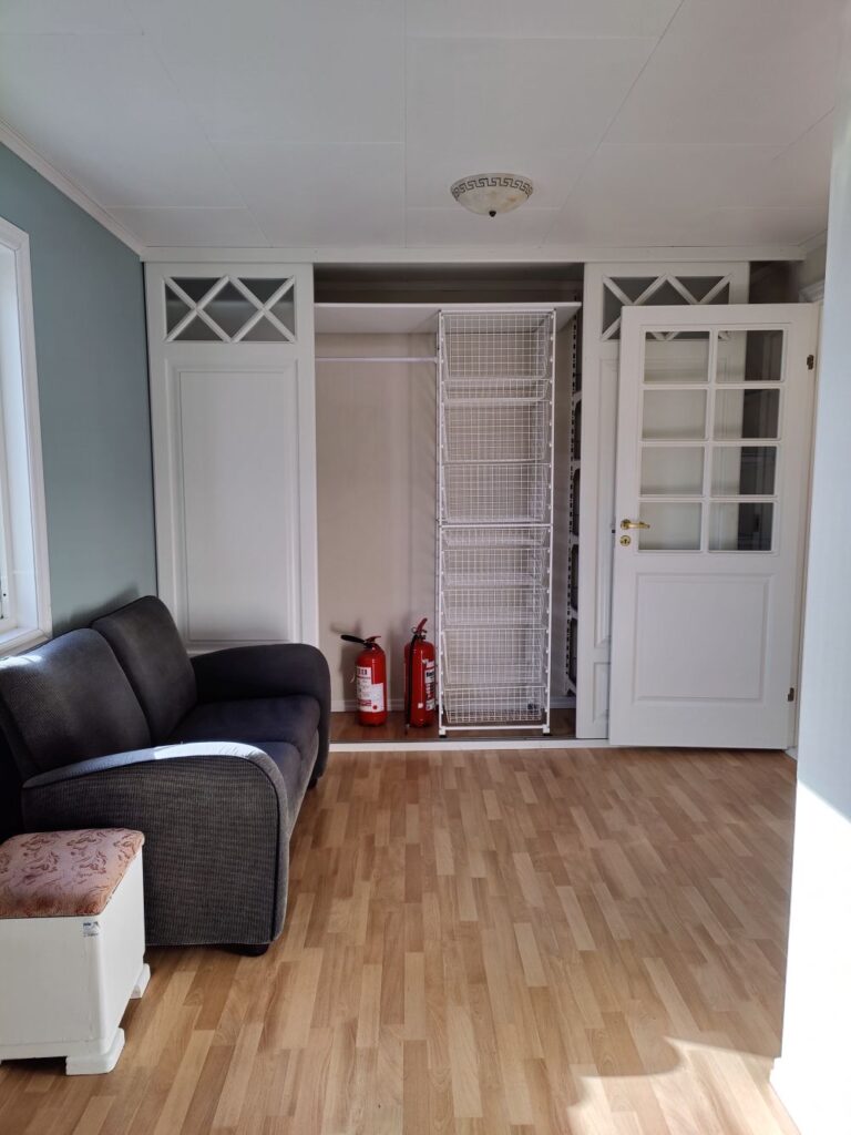 Da vi tok over huset, bestemte vi oss for at vi ønsket å flytte trappen opp til 2. etg fra stuen og ut i gangen. Den tok mye plass og lys fra stue/kjøkken der den opprinnelig sto, og med endringene i 2. etg var det mer naturlig å flytte den. Siden garderobeskapene måtte vike for trappen, ble løsningen plassbygd garderobe under trappen. Inni skapet er det ingen stammer, kun et åpent rom med hyller og garderobestang til oppheng. Her har vi også ladestasjonen til robotstøvsugeren.
