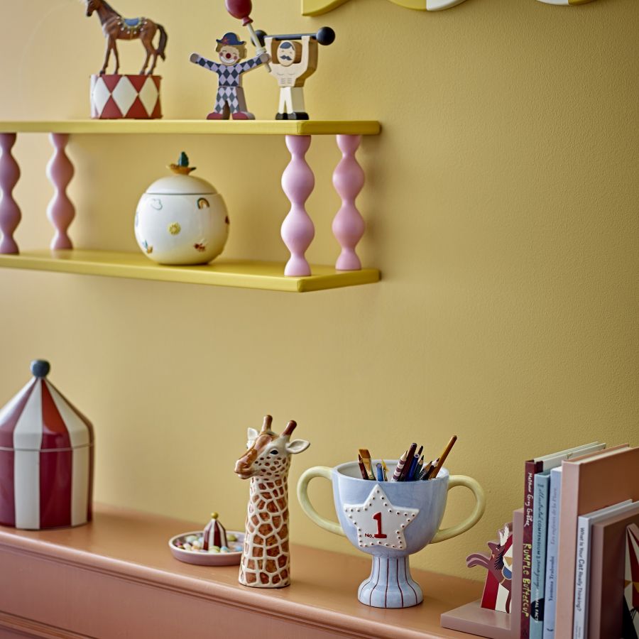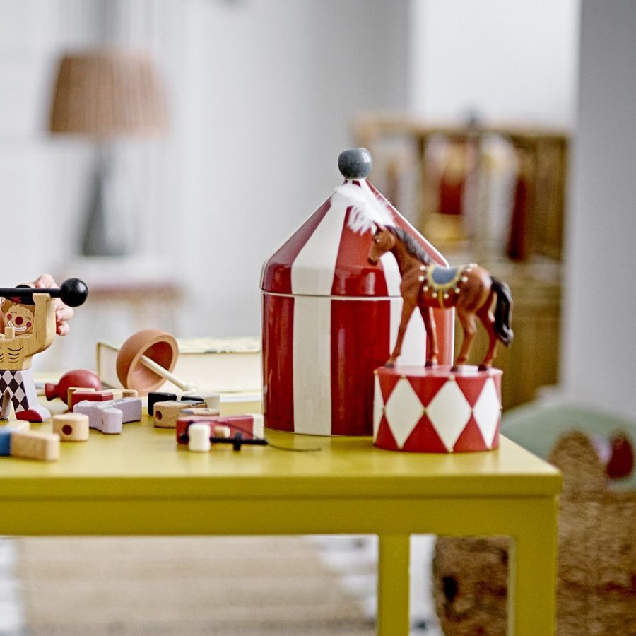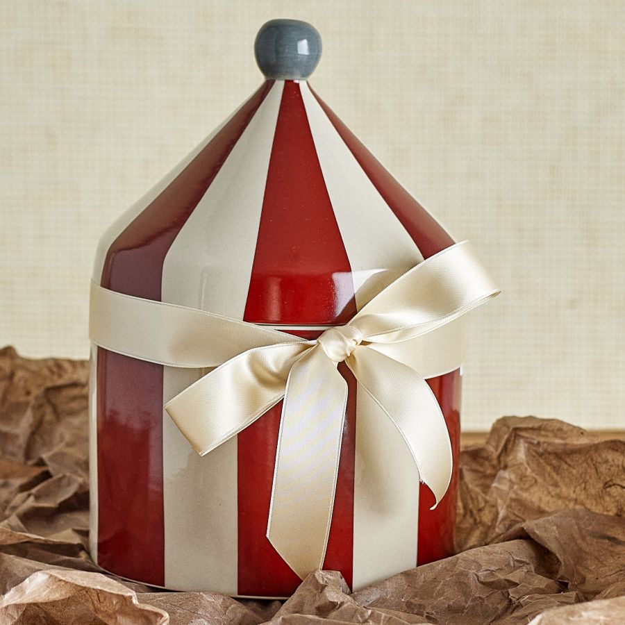 Denne søte krukken i steintøy fra Bloomingville er formet som et sirkustelt med striper i rød og hvit. Den er perfekt for å oppbevare små skatter, leker eller godteri.