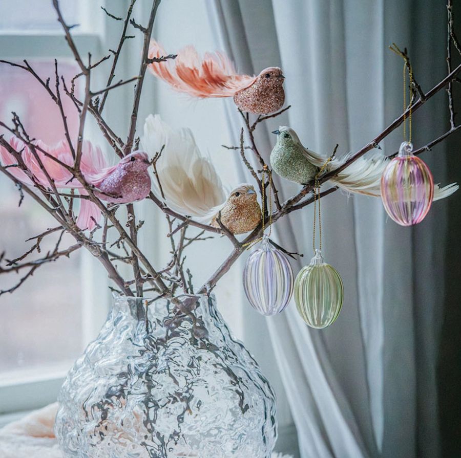 Dekorative egg i glass med fargede striper fra A Lot Decoration. Perfekte til å pynte en grein med til påske.