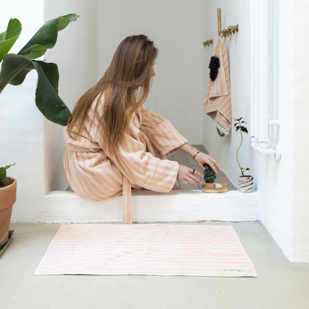 Stilig og fargerik badematte i tykk bomull fra danske Bongusta. Denne er myk under føttene, samtidig som den absorberer vann godt. Delikate og fine farger – perfekt detalj til badet!